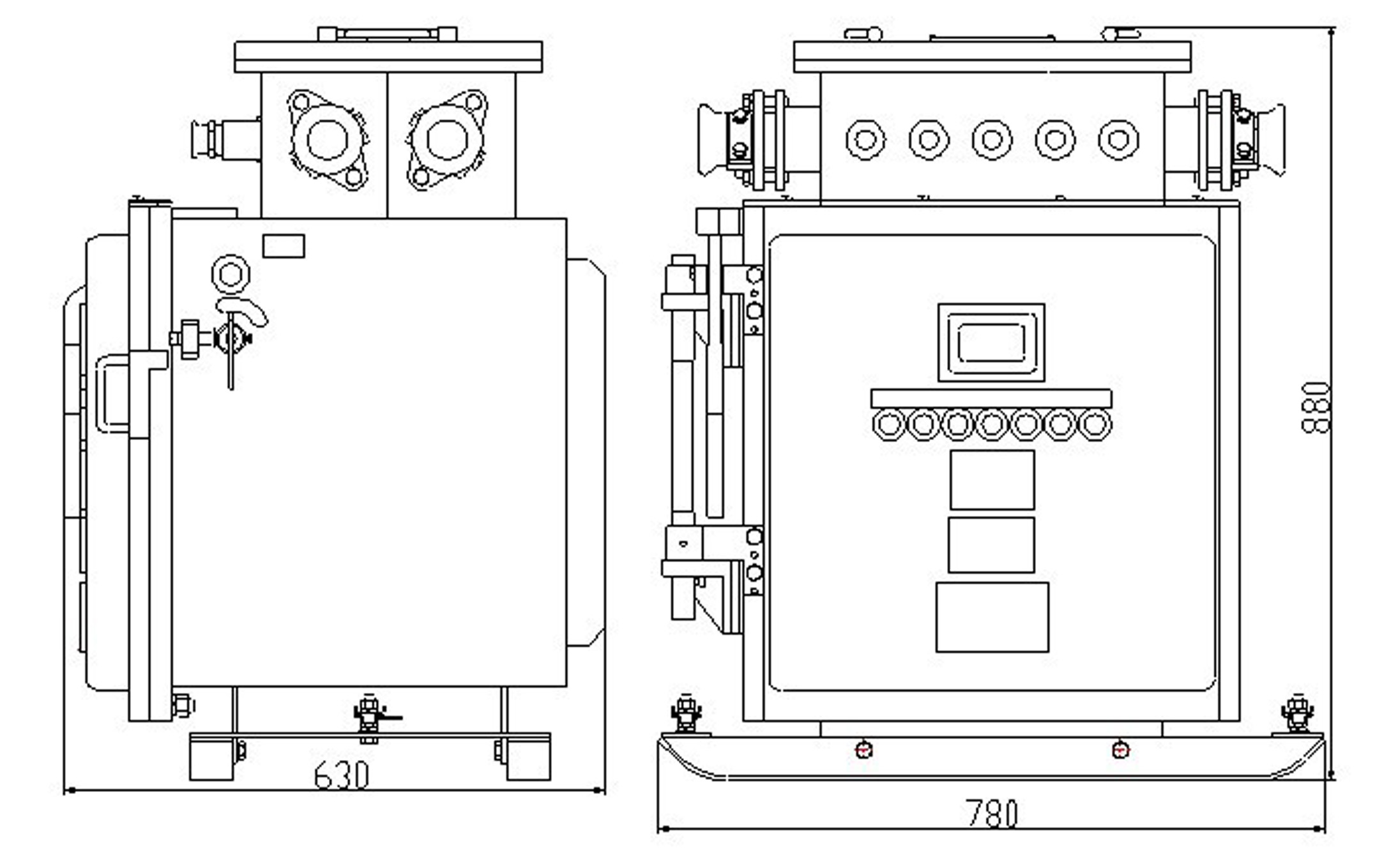 綜合裝置由隔爆外殼、主變壓器和控制部分等組成。隔爆外殼為方形,殼蓋與殼身采用滑動(dòng)止口結(jié)構(gòu),開(kāi)啟方便。外殼上部的接線箱作為引進(jìn)和引出電纜用,外殼右側(cè)裝有操作組合開(kāi)關(guān)的手柄,并有可靠的機(jī)械聯(lián)鎖裝置,門蓋上裝有控制按鈕和試驗(yàn)按鈕,門蓋上有一觀察窗,可以從外面觀察到裝置里面液晶漢顯顯示屏的指示狀態(tài)。殼體內(nèi)的控制部分由控制器件板和真空交流接觸器板組成。在控制器件板上裝有微電腦控制器、液晶顯示屏、電流取樣板、電流傳感器、濾波器、電源控制變壓器、試驗(yàn)電阻、保險(xiǎn)等器件。真空交流接觸器板上裝有真空交流接觸器、管式熔斷器,電流互感器,三相電抗器等器件。控制器件板與真空交流接觸器板通過(guò)一組航空插件及連線構(gòu)成聯(lián)系。防爆外殼箱體內(nèi)裝有主變壓器。